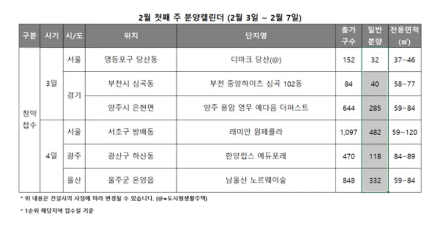 이외에도 경기 부천시 ‘부천 중앙하이츠 심곡 102동’(40가구), 광주 광산구 ‘한양립스 에듀포레’(118가구) 등이 청약 접수를 진행할 예정이다.