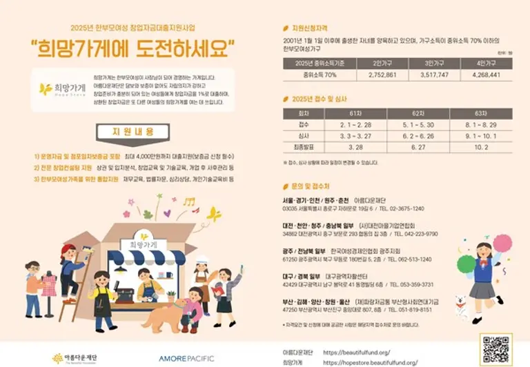 |스마트투데이=김세형 기자| 아모레퍼시픽이 아름다운재단과 함께 한부모 여성 창업대출 지원사업 ‘희망가게’의 창업주를 2월 1일부터 28일까지 공개 모집한다고 3일 밝혔다.