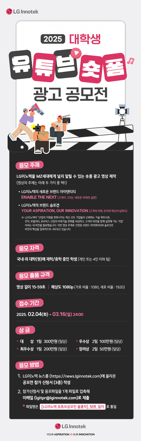 |스마트투데이=김세형 기자| LG이노텍(대표 문혁수)은 대학생 대상 유튜브 광고 공모전을 개최한다고 4일 밝혔다.