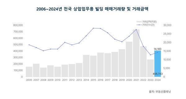부동산플래닛 정수민 대표는 "지난해 전국 상업업무용 빌딩 시장은 거래량과 거래금액 모두 반등했지만, 거래량은 2006년 이후 역대 두 번째로 낮은 수준"이라며 "시장 회복세로 단정 짓기에는 아직 이른 상황"이라고 분석했다.