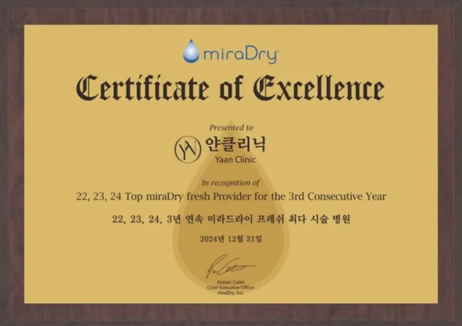 얀클리닉 관계자는 "미라드라이 시술은 단순히 땀을 줄이는 것을 넘어 환자들의 삶의 질을 높이는 데 기여하는 시술로, 그 효과와 안전성을 바탕으로 고객들이 신뢰할 수 있는 치료를 제공해왔다”며, “이번 3년 연속 상패 수여는 얀클리닉이 고객의 필요에 맞춘 최상의 서비스를 지속적으로 제공한 결과로, 앞으로도 미라드라이를 포함한 다양한 피부 및 미용 치료에 대한 신뢰를 이어갈 것"이라고 말했다.