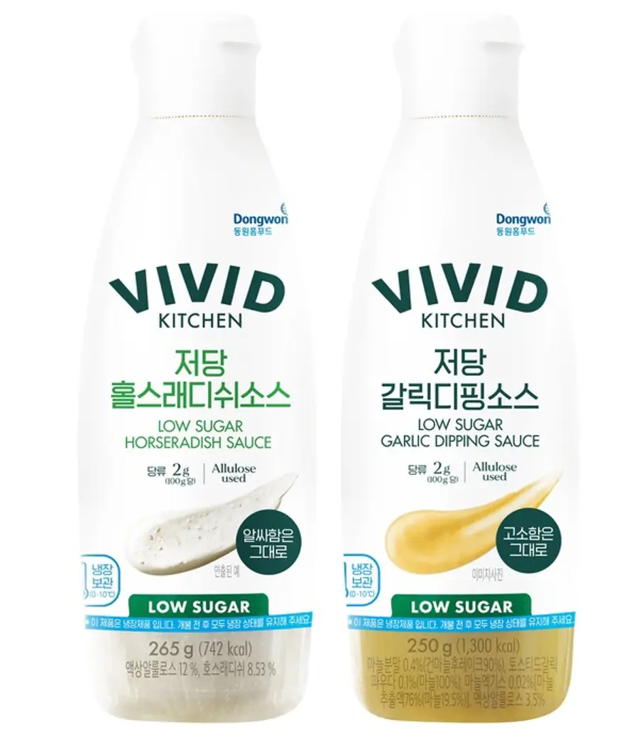비비드키친 저당 소스 신제품은 홀스래디쉬, 갈릭디핑 등 2종이다. 설탕 대신 대체당인 알룰로스를 활용하여 100g당 당류 함량이 2g에 불과해 부담 없이 즐길 수 있다.