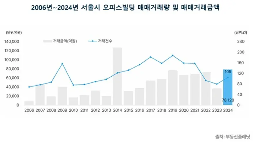 상업용 부동산 전문 프롭테크 기업 부동산플래닛이 11일 발표한 '2024년 연간 서울시 오피스 매매 및 12월 임대시장 동향 보고서'에 따르면 지난해 서울 오피스 빌딩 거래금액은 7조8128억원으로 전년도(3조6306억원) 대비 115.2% 증가했다. 2021년 이후 연간 100건을 넘지 못했던 서울시 오피스빌딩 거래량도 지난해 105건으로 전년도 80건 대비 31.3% 늘었다.