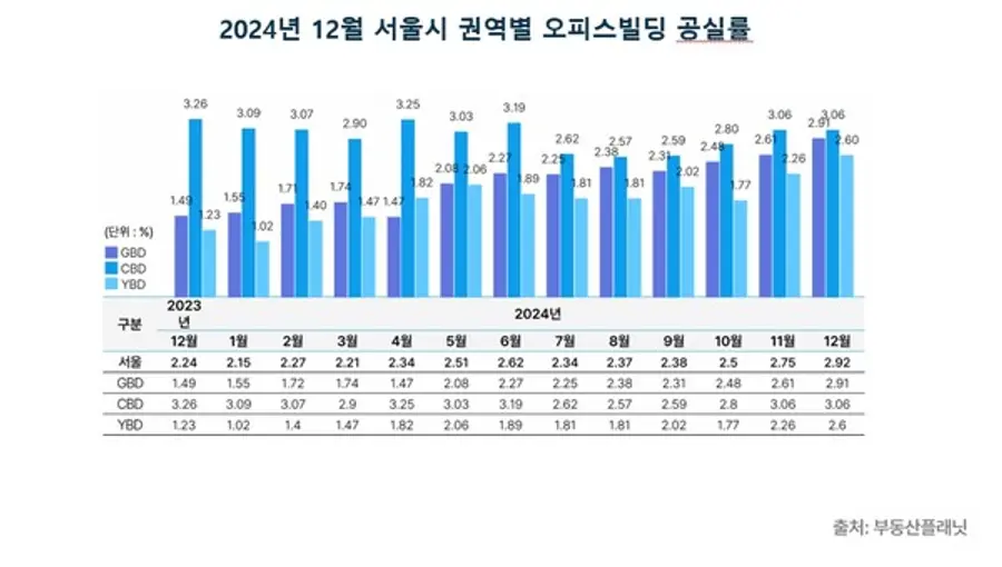 서울 오피스빌딩 공실률은 2.92%로 전월(2.75%) 대비 0.17%p 상승했다. 주요 권역별로는 지난 11월과 동일한 CBD(3.06%)를 제외한 GBD(2.91%), YBD(2.60%) 모두 소폭 상승했다.