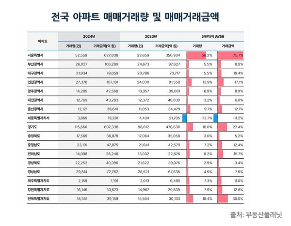 부동산플래닛 정수민 대표는 “2024년 전국 부동산 시장은 3년 연속 하향세를 지속하던 거래량과 거래금액이 모두 상승 전환하며 회복 움직임을 보였다”며, “지난해 7월 뜨겁게 달아올랐던 아파트 시장, 최근 수익형 부동산으로 각광받는 오피스텔 시장 등 일부 부동산 유형의 매매 활성화가 거래량과 거래금액의 동반 상승을 이끈 것으로 보인다”고 전했다.