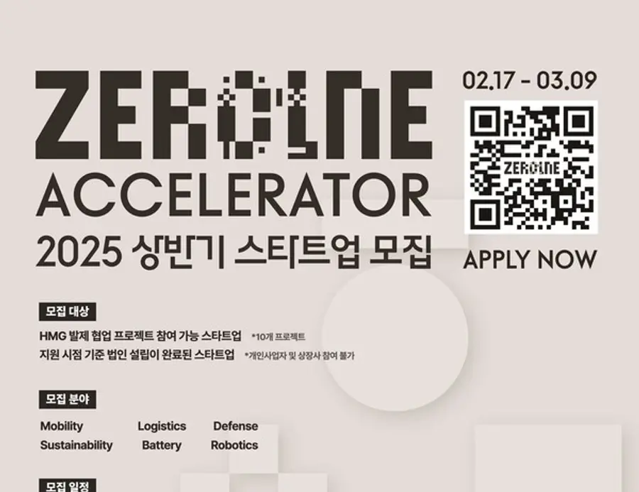 |스마트투데이=이주영 기자| 현대자동차그룹은 오픈 이노베이션 플랫폼 ‘제로원’을 통해 우수한 역량을 가진 사외 스타트업을 발굴하는 ‘제로원 액셀러레이터(ZER01NE ACCELERATOR)’의 2025년 상반기 공개 모집을 시작한다고 17일 밝혔다.