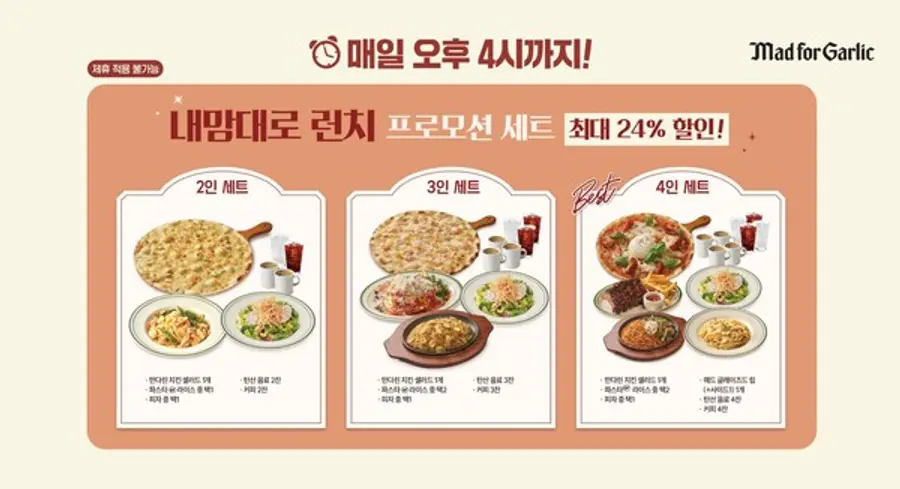 ‘내맘대로 런치’ 프로모션 세트는 2인 세트와 3인 세트, 4인 세트로 구성돼 있으며 2인 세트는 파스타와 라이스 중 한 가지 메뉴와 피자를 원하는 메뉴로 골라 선택할 수 있다. 3인 세트는 파스타와 라이스 중 2종과 피자 1종을, 4인 세트는 파스타와 라이스 중 2종과 피자 1종 그리고 사이드 메뉴가 포함된 매드 글레이즈드 립이 포함된다.