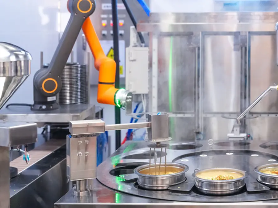 한화로보틱스 조리로봇이 라면을 끓이고 있다.