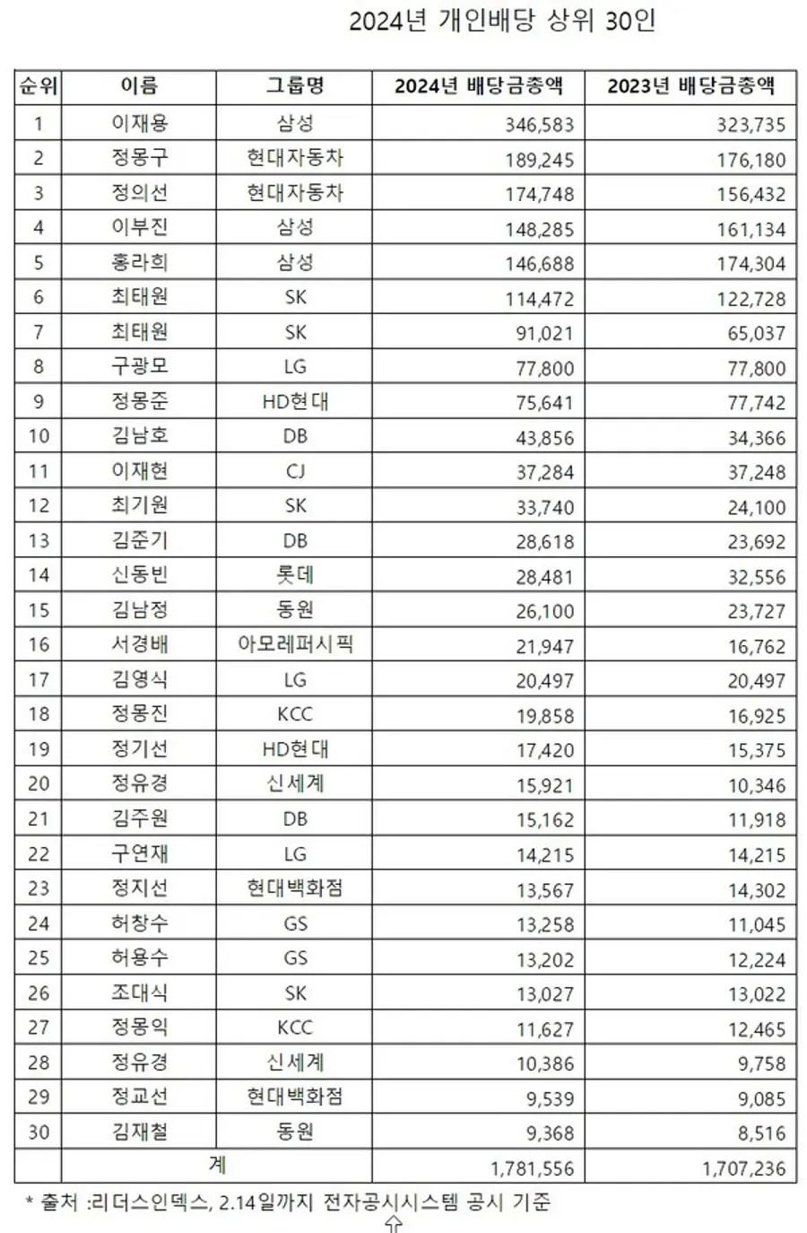 |스마트투데이=한민형 기자| 삼성, LG, SK 등 주요 재벌가의 배당이 주요 계열사 실적에 따라 희비가 엇갈렸다. 특히 HBM 특수로 이익이 급증한 최태원 회장 등 SK家의 배당 수익이 급증한 반면, 위기론에 절치부심중인 삼성 일가의 예상 배당액은 전년비 258억원이 감소했다.