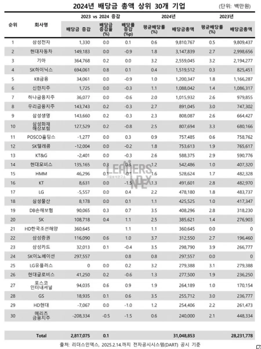 한편 올해 배당금을 1조원 이상 지급한 기업은 총 7곳으로 확인됐다. 삼성전자가 가장 많은 9조8107억원이었으며, 현대자동차가 3조1478억원, 기아 2조5590원, SK하이닉스 1조5195억원, KB금융 1조2003억원, 신한지주 1조880억원, 하나금융지주 1조159억원 순이었다.