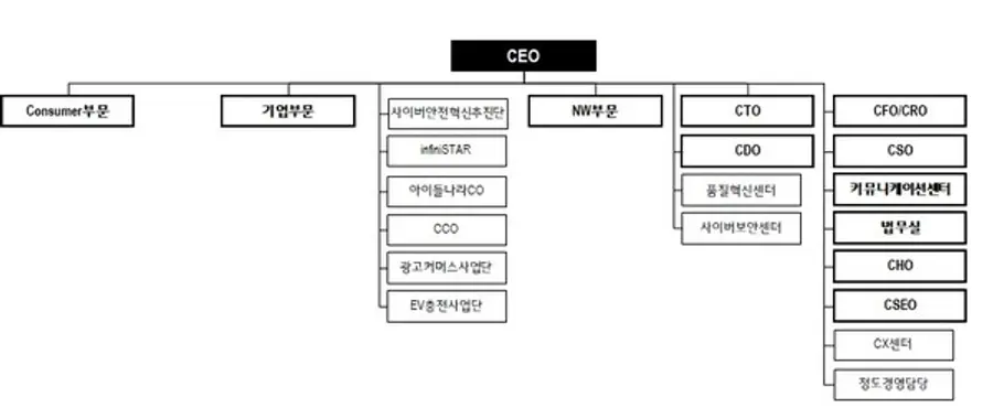 LG유플러스 조직도 2025년 2월 LG유플러스가 20일 주주총회소집공고에서 공개한 2025년 2월 조직도다. 1년 전에 비해 한결 단순화된 모습이다. 특히 1년 전에 존재했던 CDO(최고디지털책임자)와 CCO(최고고객책임자)가 보이지 않는다.