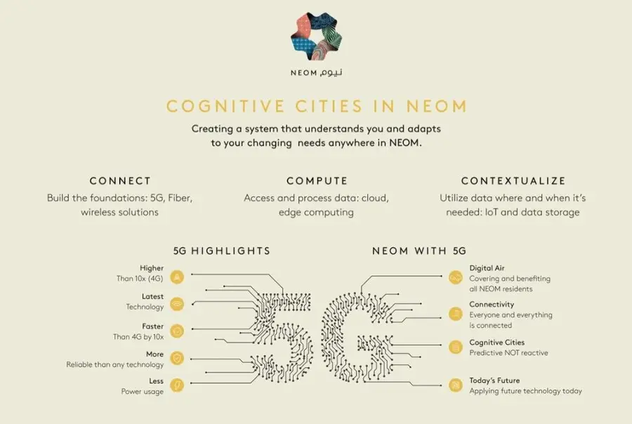 이 같은 사정과 관계 없이 스마트시티 구축을 위해 설립된 합작 주식회사 네옴(NEOM Co.)은 5G레이다에서 사우디텔레콤과의 파트너십을 통해 5G 기술에 의존하게 될 최초의 '인지적 도시'를 만들 수 있을 것이라고 설명하고 있다.