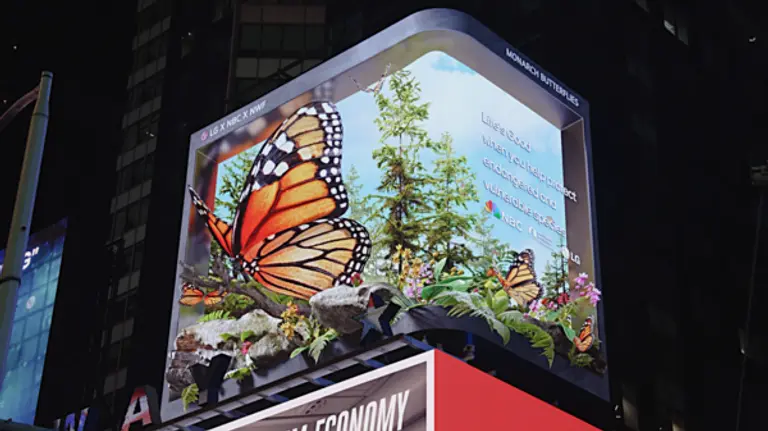 LG전자는 현지시간 18일 미국 뉴욕 타임스스퀘어 전광판에 ‘LG와 함께하는 멸종위기종 보호 캠페인(The LG Endangered Species Series)’의 5번째 영상 모나크 나비' 편을 공개했다.