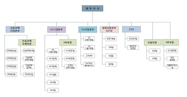 자이에스앤디가 최근 제출한 2025 정기 주주총회 소집공고에 첨부한 2025년 2월 현재 조직도다. 주택개발사업본부가 건축주택사업본부로 변경됐다.