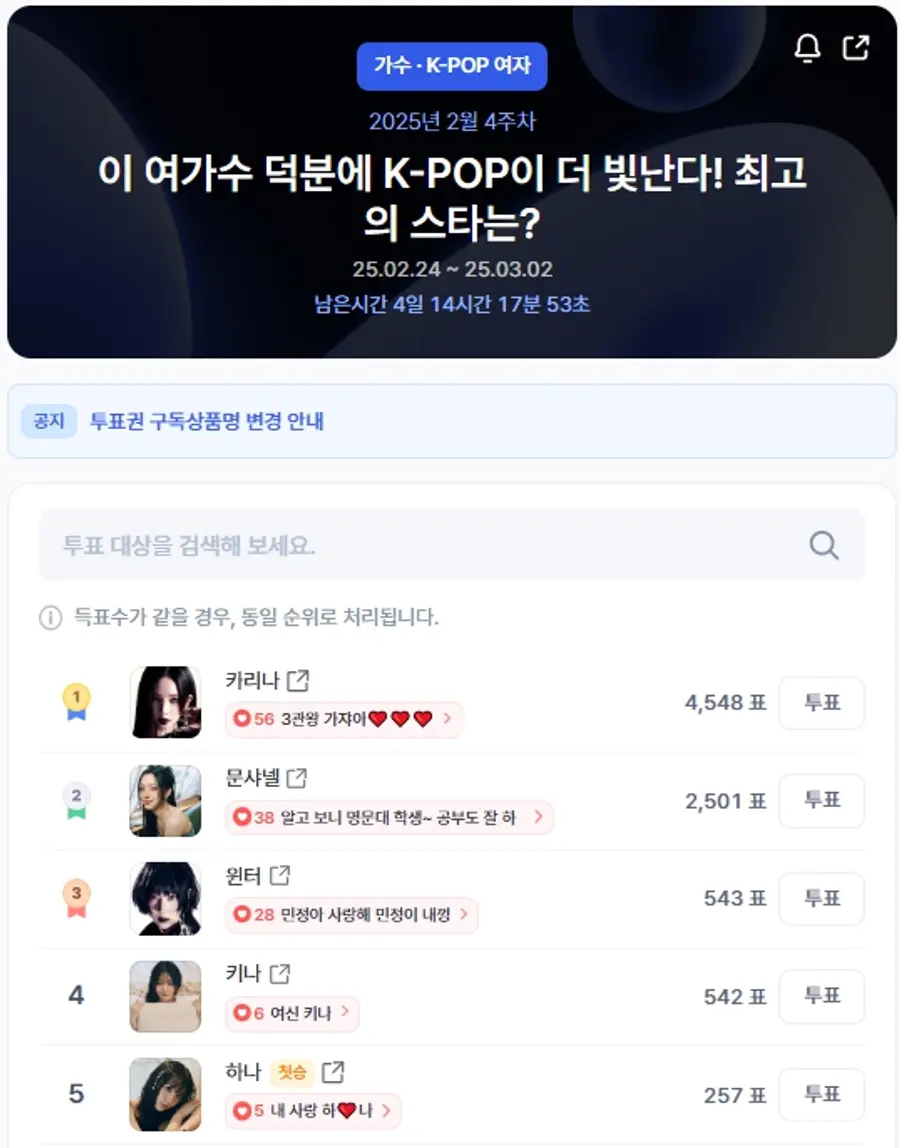 |스마트투데이=박지환 기자| 2월 4주차 디시트렌드 K-POP 여자 가수 인기 투표에서 카리나가 4,548표를 얻으며 1위를 유지하고 있다.