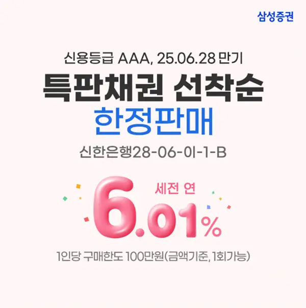|스마트투데이=김세형 기자| 삼성증권은 비대면 신규 고객 대상으로 세전 연 6%(25.02.26일기준, 만기보유시 가정)대 특판 채권을 선착순으로 판매한다고 27일 밝혔다.