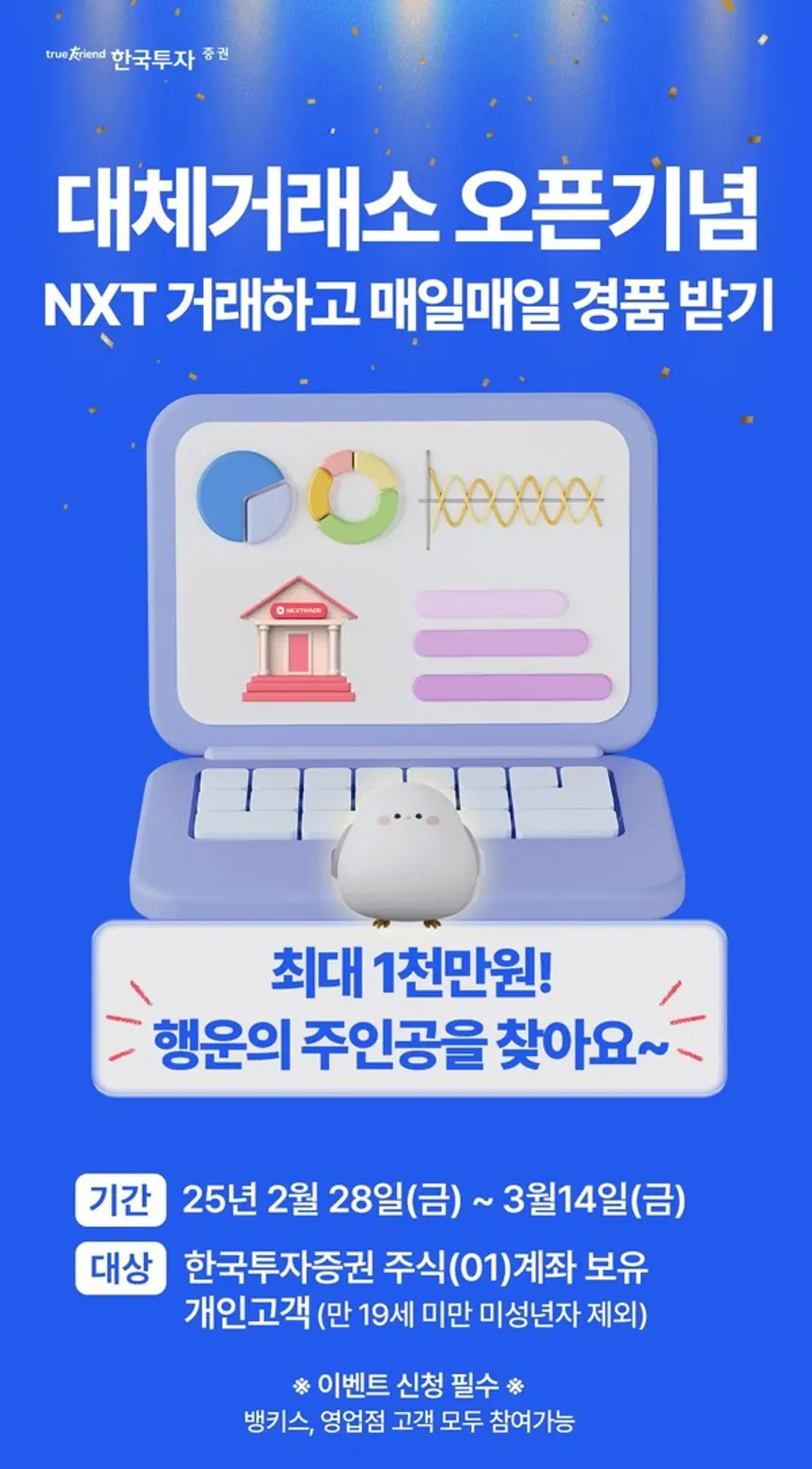 |스마트투데이=김세형 기자| 한국투자증권(사장 김성환)은 다음달 4일 대체거래소 넥스트레이드(NXT) 출범을 기념하며 최대 1000만원 혜택의 이벤트를 3월 14일까지 진행한다고 28일 밝혔다.