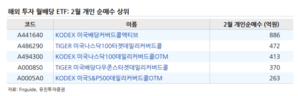 반면 개인투자자들은 지난 2월 삼성자산운용의 KODEX 미국배당커버드콜액티브, 미미래에셋자산운요의 TIGER 나스닥100데일리커버드콜을 각각 890억원, 470억원 순매수했다. 이외에도 2월에 개인투자자들이 많이 순매수한 해외 투자 월배당 ETF 5개는 모두 커버드콜 상품으로 집계됐다.
