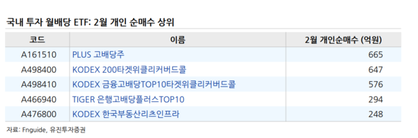 그는 "국내 투자 월배당 ETF는 외국납부세액 공제 변경에 따른 영향에서 자유롭다"며 2월에 개인은 PLUS 고배당주, KODEX 200타겟위클리커버드콜 등을 각각 660억원, 650억원 순매수해, 순매수가 가장 많았다"고 밝혔다.