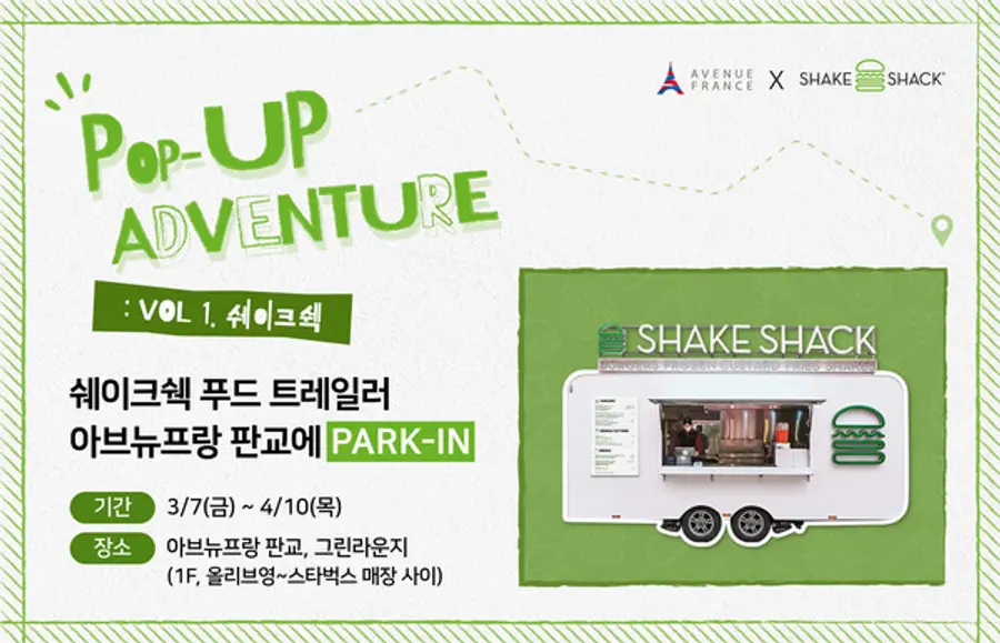 '팝업 어드벤처'의 첫 번째인 쉐이크쉑 푸드 트레일러 팝업은 경기도 성남시 아브뉴프랑 판교의 그린라운지(중앙광장)에서 진행된다. 쉐이크쉑의 인기 메뉴인 버거, 프라이, 음료 등을 고풍스러운 유럽풍 공간에서 즐길 수 있다. 오픈일인 3월 7일 단 하루동안은 2만 원 이상 구매 고객에게는 선착순으로 리유저블 컵을 증정하는 프로모션도 진행한다.