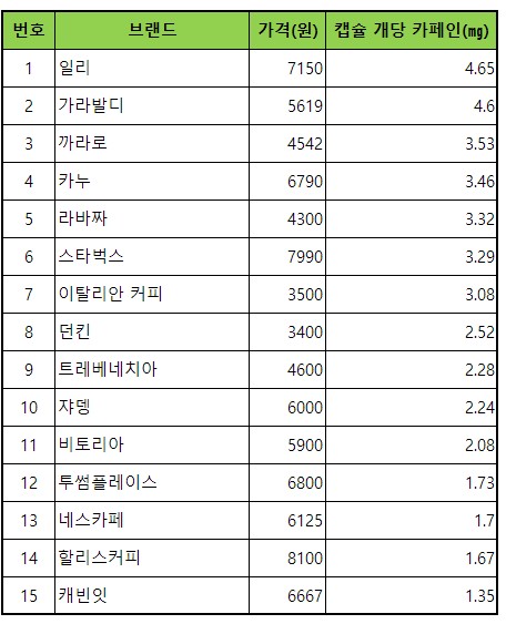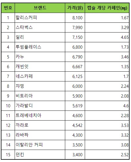 다음은 브랜드별 가격과 카페인 함량 수준.