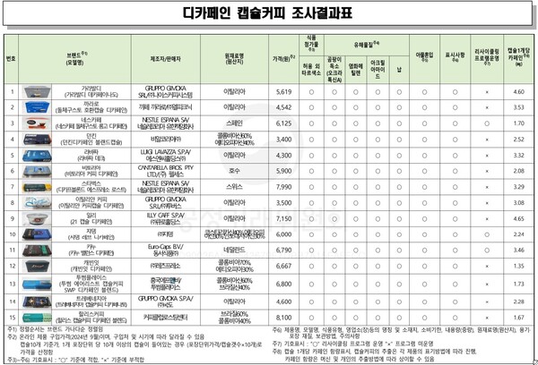 7일 공정거래위원회 소비자24에 따르면 시판중인 디카페인 캡슐커피 15종이 모두 관련기준에 적합한 것으로 나타났다. 다만 일부 소비자들이 우려하는 카페인 과다 섭취를 감안, 제품별 카페인 제거율에 대한 관심이 필요하다고 밝혔다.