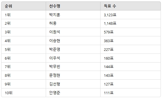 이번 투표에서는 박지훈이 3,123표를 획득하며 2위 허웅과 1,975표 차이를 벌리는 압도적인 승리를 기록했다.