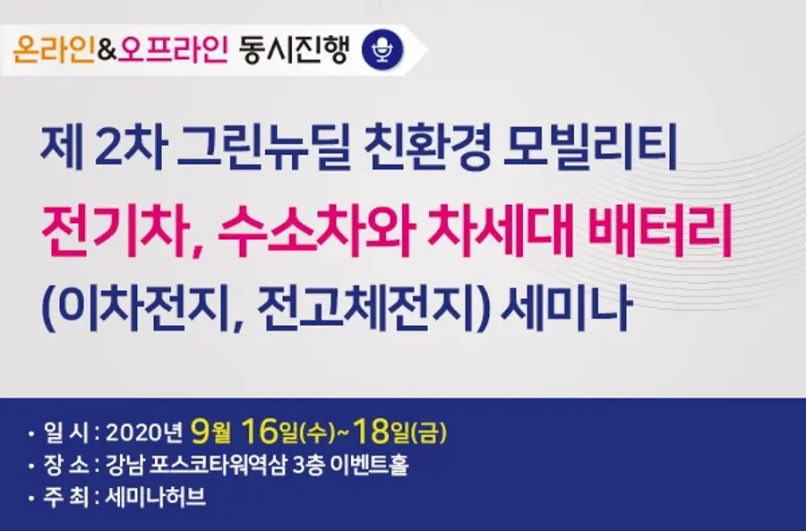이같은 흐름을 반영하는 세미나가 열린다. 세미나허브는 9월 16일부터 18일까지 3일 동안 서울 강남 포스코타워역삼에서 ‘제2차 그린뉴딜 친환경 모빌리티(전기차, 수소차) 최신 기술 및 전략 세미나’와 ‘제2차 2020년 차세대 배터리(이차전지, 전고체전지) 핵심기술 동향 및 전망 세미나’를 개최한다.