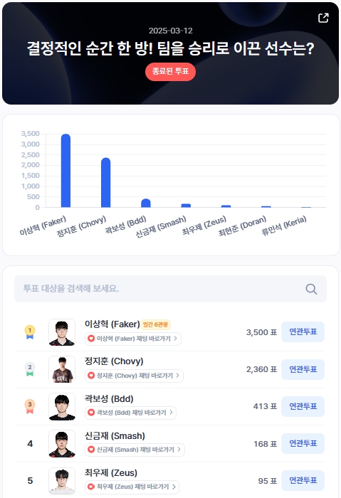 이번 투표에서 T1의 이상혁(Faker)이 3,500표를 획득하며 압도적인 차이로 1위를 차지했다. LoL의 살아있는 전설로 불리는 페이커는 여전히 독보적인 팬층을 보유하고 있음을 입증했다.