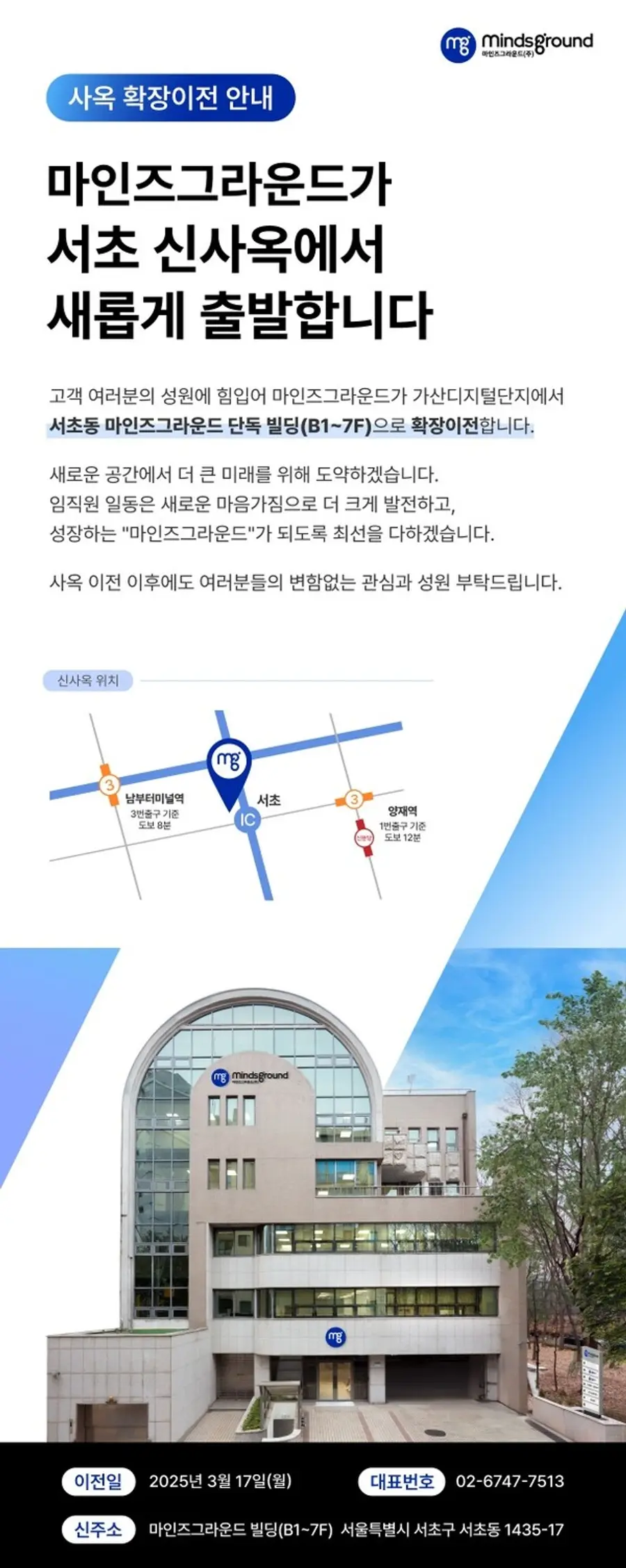 한편, 마인즈그라운드 신사옥은 서초구 서초동 1435-17에 자리 잡고 있으며, 연면적 1,599㎡(484평) 규모로, 지하 1층부터 지상 7층까지 구성되어 있다.