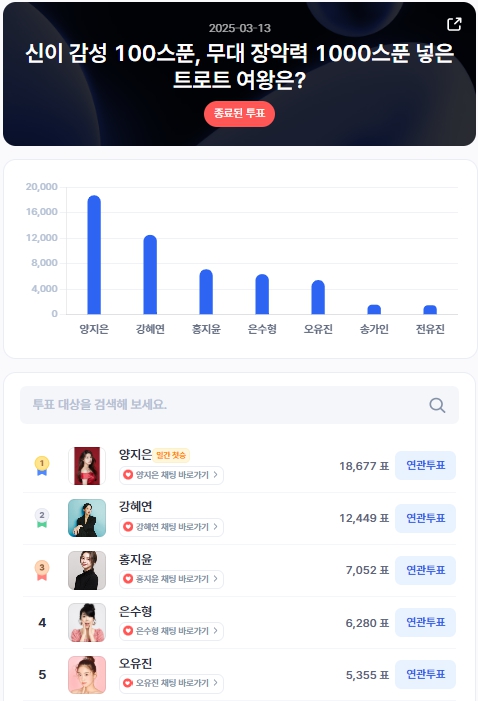 이번 투표에서 양지은이 18,677표를 획득하며 1위를 차지, ‘일간 첫승’의 영광을 안았다. 강혜연(12,449표), 홍지윤(7,052표) 이 뒤를 이어 강력한 경쟁을 펼치고 있으며, 은수형(6,280표), 오유진(5,355표) 도 상위권을 기록하고 있다.
