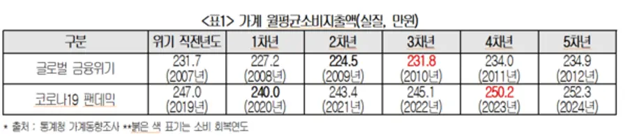 한편, 2008년 글로벌 금융위기 및 2020년 코로나19 팬데믹 직전부터 5년 간의 소비지출액 추이를 비교한 결과 소비감소의 폭, 회복패턴, 속도에서 차이를 보이는 것으로 나타났다. 금융위기 기간에는 가계의 월평균소비지출액 평균치(2008년~2009년)가 2007년 대비 2.51% 감소했으나 2010년에 2007년 수준을 회복한 반면, 코로나 직후인 2020년에는 2019년 대비 2.82% 감소 이후 3년이 지난 2022년까지 소비 규모가 2019년 수준을 밑돌며 회복 속도가 상당히 더딘 것으로 나타났다.