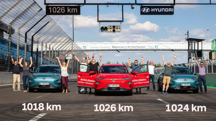 현대차에 따르면 코나 일렉트릭 3대가 7월 22일부터 24일까지 독일에서 실시된 시험주행에서 각각 1026km, 1024.1km 그리고 1018.7km의 주행거리를 달성했다. 시험에서 연비는 1kWh당 16km 안팎으로 나타나 국내 기준 공인 전비(전기차 연비)인 5.6 km/kWh를 훌쩍 뛰어 넘었다.