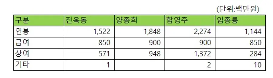 금융지주사 회장들의 급여수준은 대체로 비슷했다. 월급여가 7100만원 내지 7500만원 수준으로 연간 고정연봉 수준이 9억원(양종희 회장, 함영주 회장)과 8억5000만원(진옥동 회장, 임종룡 회장)이다.
