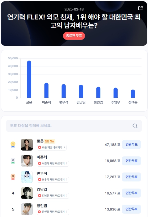 이번 투표는 3월 23일까지 진행되며, 최종 주간 투표 결과는 3월 24일에 공개될 예정이다. 로운이 1위를 유지할지, 이준혁과 변우석이 반격할지 팬들의 관심이 집중되고 있다.