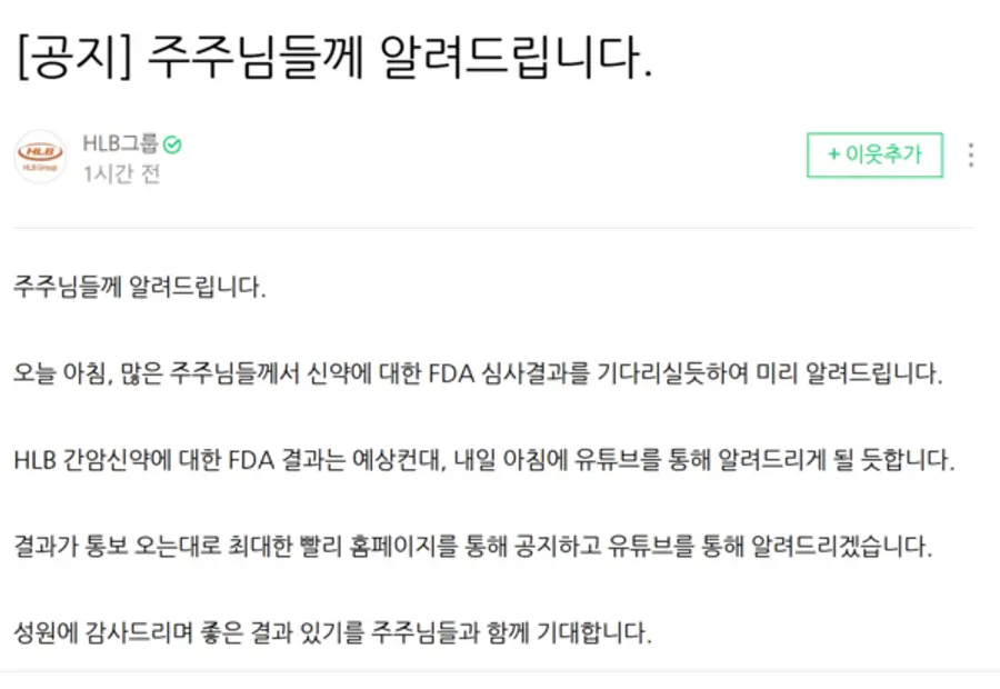 HLB는 "많은 주주님들께서 신약에 대한 FDA 심사결과를 기다리실듯하여 미리 알려드린다"며 이같이 공지했다.