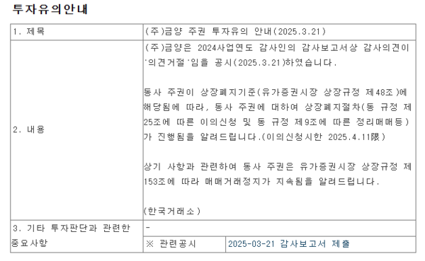 |스마트투데이=이재수 기자| 2차전지 소재 기업 금양이 상장폐지 기로에 놓였다. 21일 금융감독원에 제출된 감사보고서에 따르면 금양의 회계법인인 한울회계법인은 감사의견으로 '의견거절'을 통보했다.