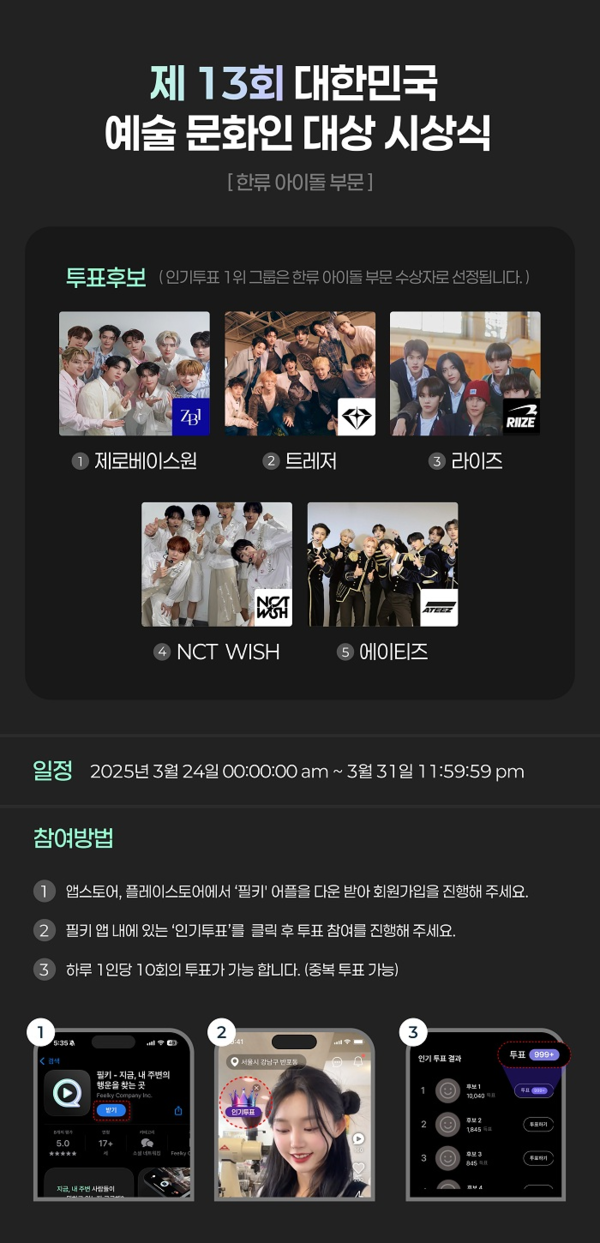 이번 시상식의 공식 인기 투표 앱으로 선정된 ‘필키(Feelky)’는 실시간 지역기반 영상 소통 플랫폼으로 한류 아이돌 부문 투표 후보에 오른 아티스트의 글로벌 팬들에게 뜨거운 관심을 받고 있다. 후보 아티스트로는 제로베이스원, 트레저, 라이즈, NCT WISH, 에이티즈가 있다.