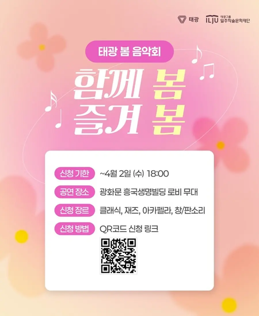 |스마트투데이=이재수 기자| 태광그룹이 4월 한 달간 서울 광화문 흥국생명빌딩 1층 로비에서 ‘봄 음악회’를 개최하고, 아마추어 음악가의 버스킹 공연 신청을 받는다고 26일 밝혔다.