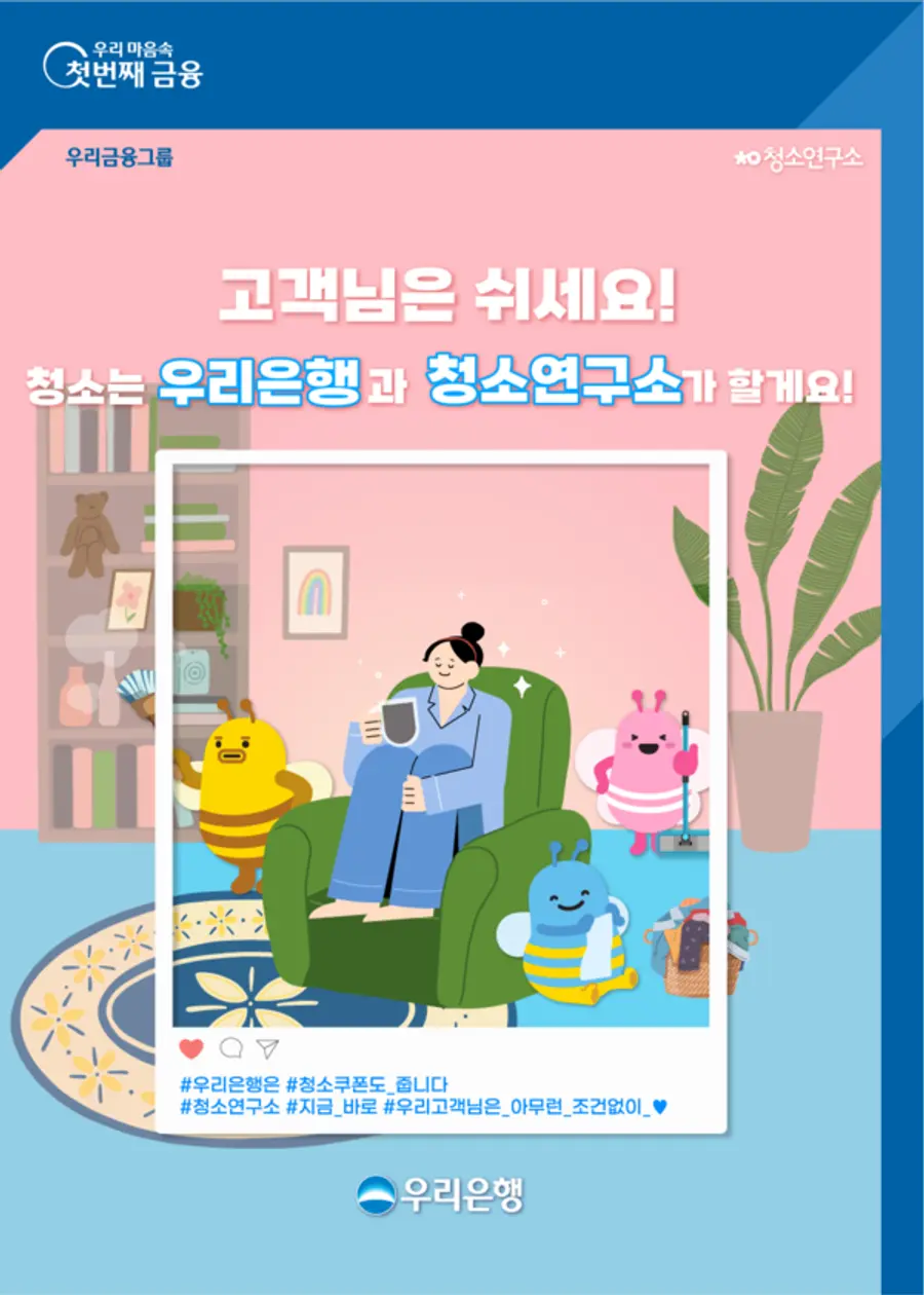 |스마트투데이=김국헌 기자| 우리은행은 오는 4월 14일까지 우리WON뱅킹 앱(애플리케이션)에서 홈클리닝 서비스 플랫폼 ‘청소연구소’ 이용 쿠폰을 제공하는 ‘우리 고객님은 쉬세요!’ 이벤트를 한다고 26일 밝혔다.