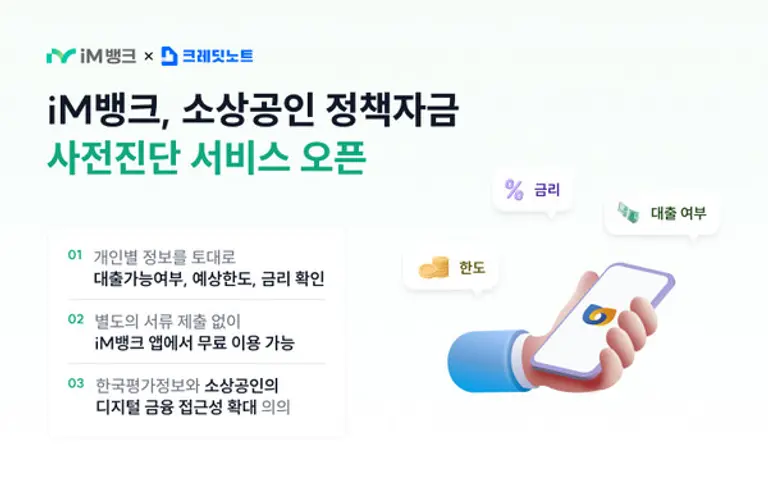 이민제 한국평가정보 대표는 “이번 iM뱅크 앱 내 ‘소상공인 정책자금 사전진단’ 서비스 런칭은 소상공인의 금융 접근성을 높이는 중요한 사례”라며, “앞으로도 혁신적인 금융 서비스를 지속 개발하여 더 많은 소상공인이 안정적으로 사업을 운영할 수 있도록 지원할 것”이라고 말했다.