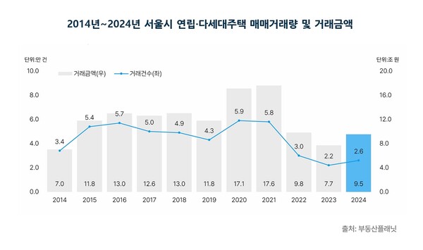 27일 상업용 부동산 전문 프롭테크 기업 부동산플래닛이 발표한 '2024년 연간 서울시 연립·다세대주택 매매 및 전·월세시장 동향 보고서'에 따르면, 서울시 연립·다세대주택 시장은 매매 거래량과 거래금액이 동반 상승하고 있는 가운데 전세 거래는 12.4% 줄었다.