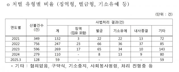 특히 2024년에는 가해자 110명 중 징역형을 받은 사람은 전무하다. 벌금형 8, 기소유예 13명 내사종결 9명이다. 이밖에 80명이 기타 (혐의없음, 구약식, 기소중지, 사회봉사명령, 처리 진행 중) 처분을 받았다.