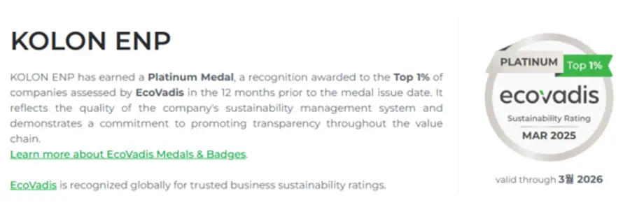 |스마트투데이=이재수 기자| 코오롱ENP가 글로벌 ESG 평가기관 에코바디스(EcoVadis)로부터 상위 1%에 부여되는 최고 등급인 ‘플래티넘’을 획득했다고 28일 밝혔다.