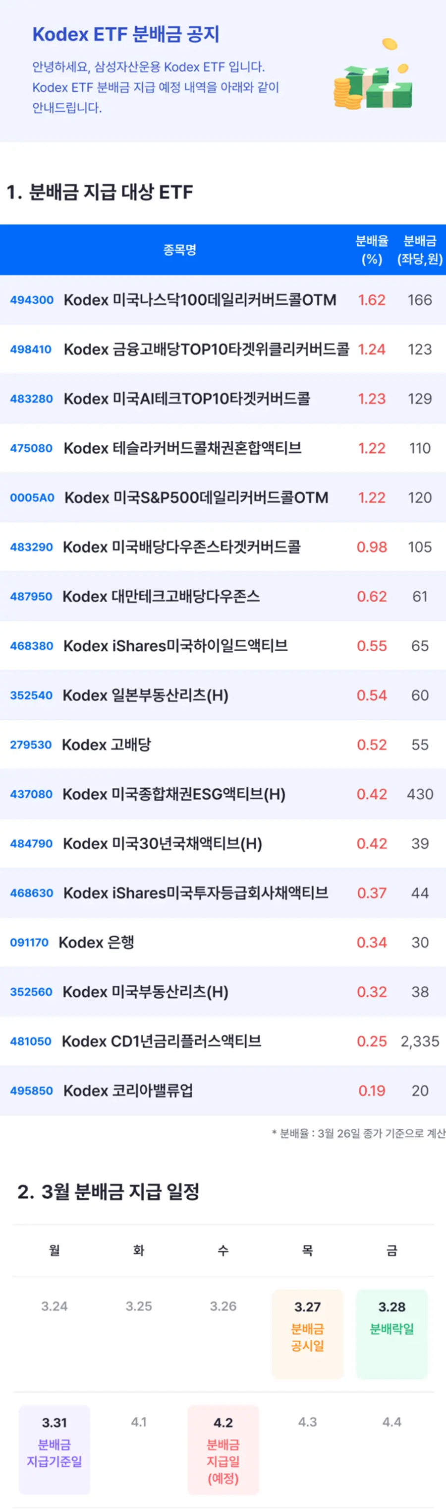 |스마트투데이=김세형 기자| 삼성자산운용은 3월 KODEX(코덱스) ETF별 월말 분배금 내역을 지난 27일 공지했다. 27일까지 매수분을 대상으로 분배금은 4월2일 지급된다.