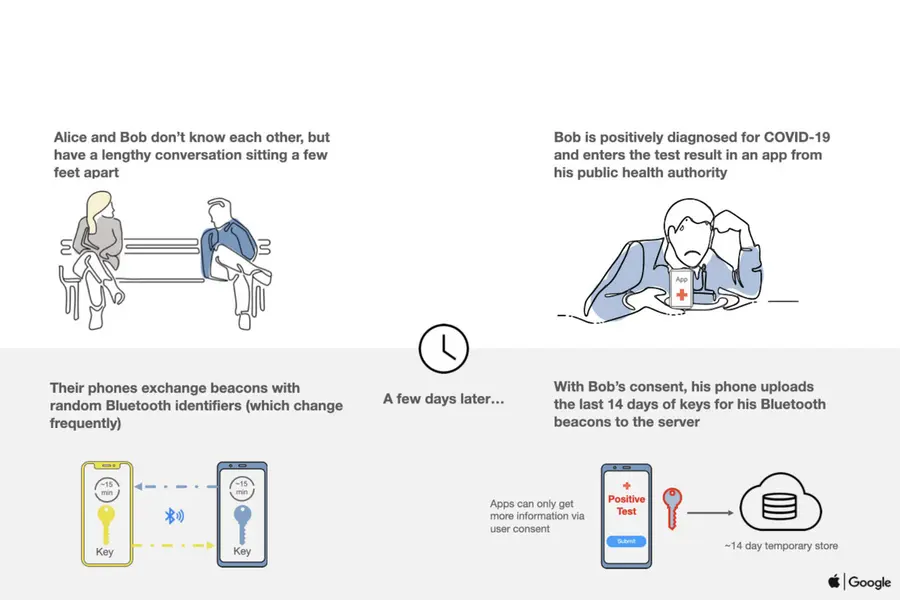 애플의 API의 경우, 사용자의 아이폰에는 임의의 블루투스 식별자가 부여된다. 이는 숫자와 문자를 조합한 고유 ID 문자열이 부여되고, 10~20분마다 바뀐다. 사용자의 스마트폰은 이 고유 ID 문자열을 가까이 다가오는 주변의 다른 모든 스마트폰에 블루투스로 전송한다. 다른 스마트폰도 각자의 식별자를 전송하고, 모든 스마트폰은 로그를 보관한다.