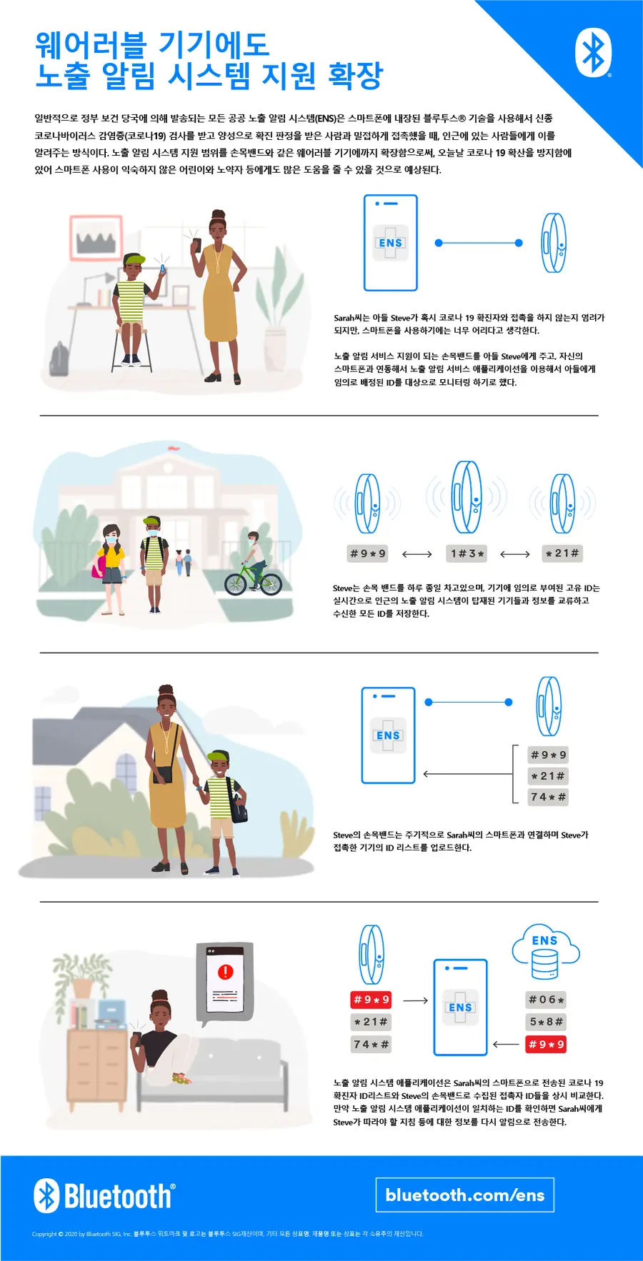 근거리 무선 통신의 국제 표준인 블루투스 기술 개발을 주관하는 블루투스 SIG가 기존의 스마트폰 기반의 노출 알림 시스템(ENS: Exposure Notification System)을 웨어러블 기기에도 적용할 수 있는 규격을 개발 중이다. 규격의 초기 버전은 향후 몇 달 이내에 공개될 예정이다.
