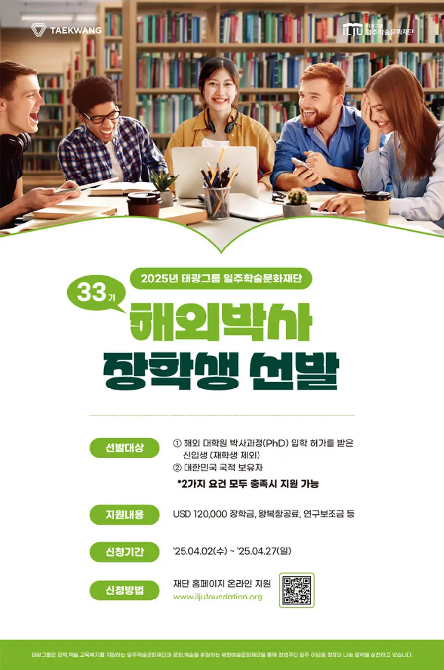 |스마트투데이=이재수 기자| 태광그룹 일주학술문화재단은 ‘2025학년도 33기 해외박사 장학생’을 선발한다고 2일 밝혔다.