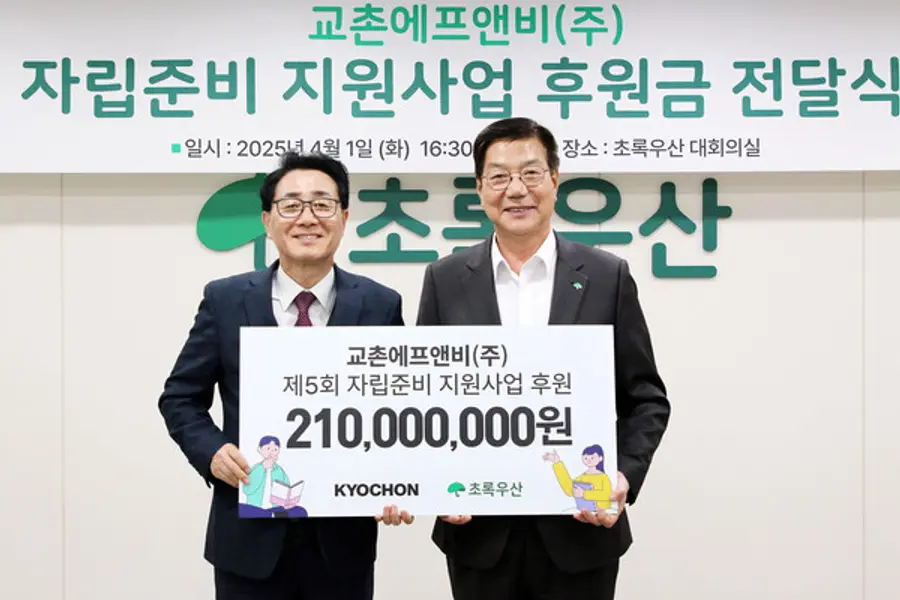 교촌에프앤비는 전일 서울시 중구에 위치한 초록우산어린이재단에서 후원금 전달식을 갖고 ‘제5회 자립준비 지원사업’에 나섰다고 2일 밝혔다.