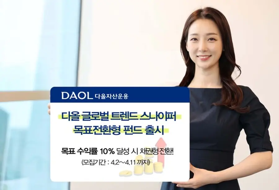 |스마트투데이=김세형 기자| 다올자산운용(대표이사 이창희)은 글로벌 시장의 주요 트렌드를 빠르게 포착해 수익을 추구하는 '다올글로벌트렌드스나이퍼 목표전환형 펀드’(이하 ‘다올트렌드스나이퍼 펀드’)를 출시했다고 2일 밝혔다.